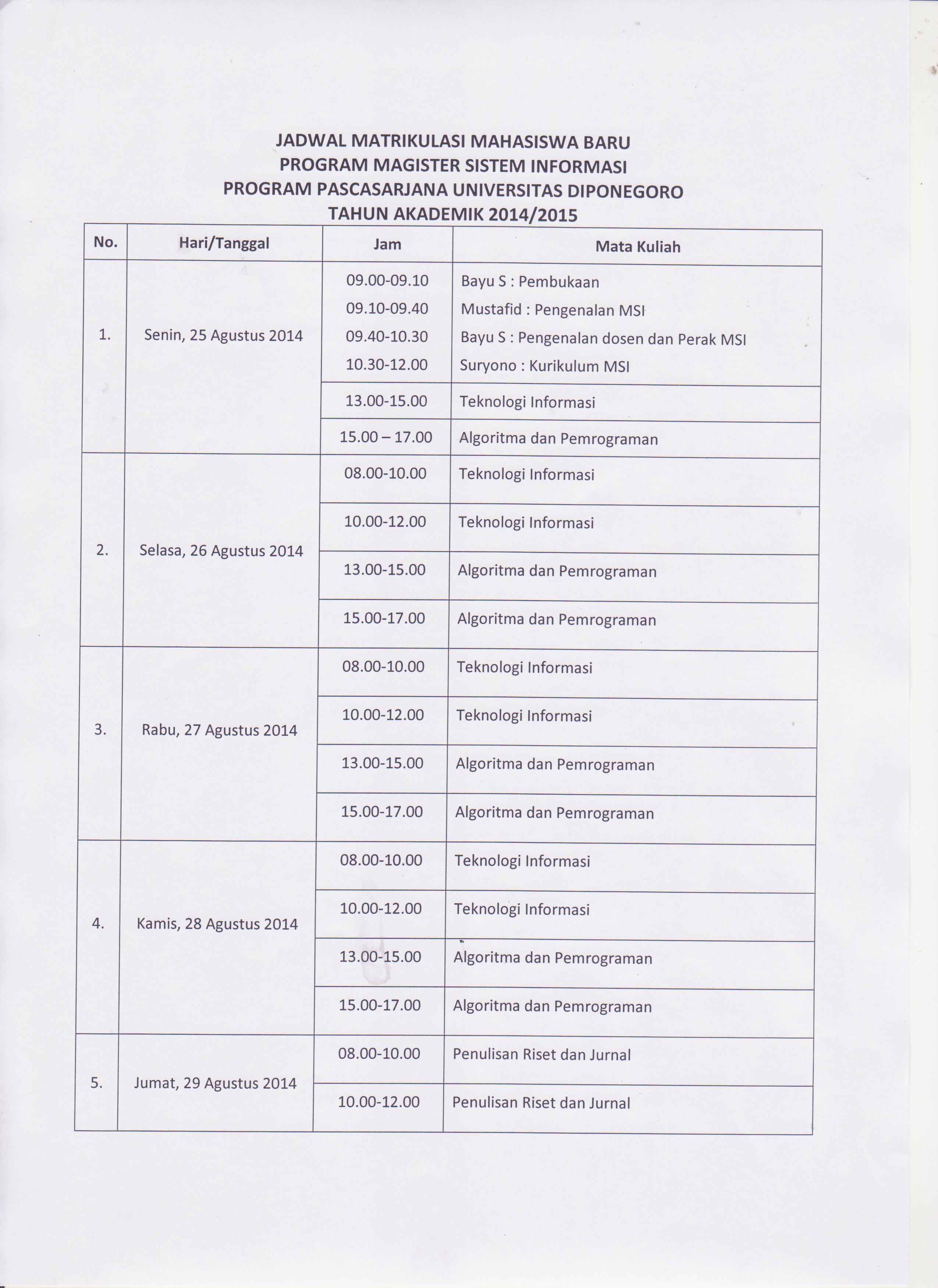Jadwal matrikulasi Tahun Akademik 2014/2015 oleh admin | Agu 21, 2014 | Info Akademik Matrikulasi dilaksanakan di kampus UNDIP Pleburan Jl.Imam Bardjo SH, gedung B lantai 6, Semarang